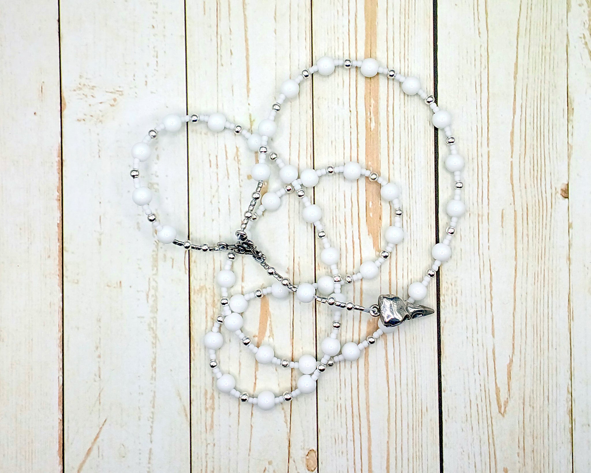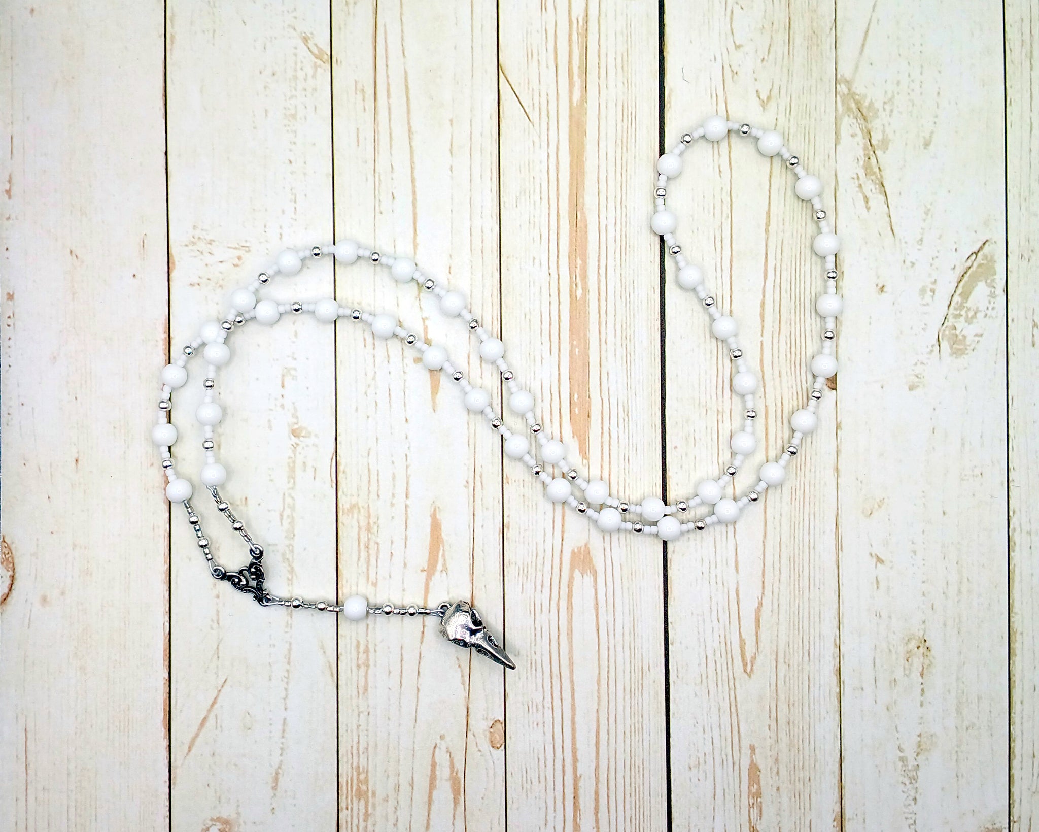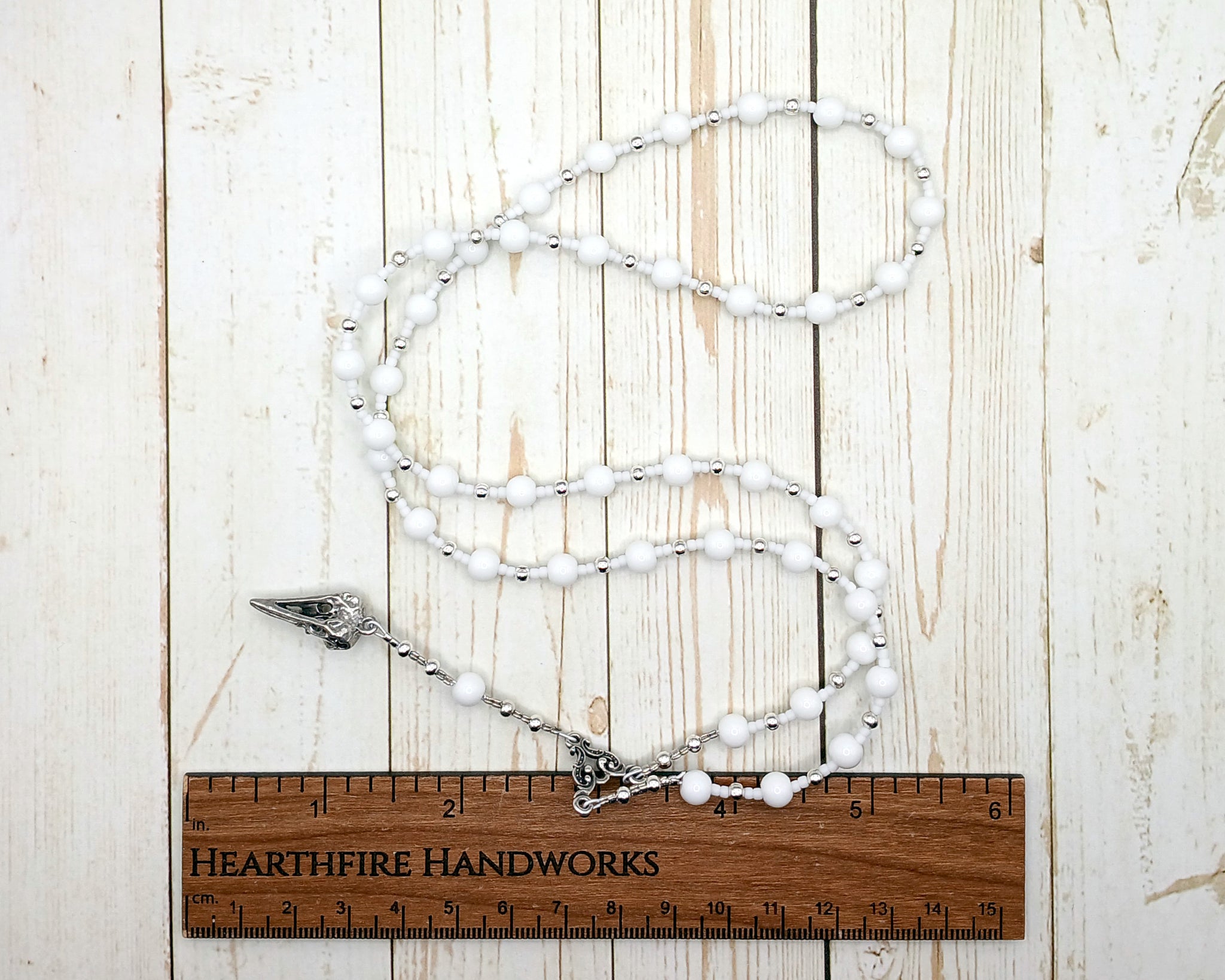It is made with 6mm white alabaster gemstone beads, separated by silver-toned metal spacer beads and glass seed beads to provide a comfortable transition from one bead to the next and to make the piece supple and easy to handle. The beads are approximately 27" (68cm) in length. They are designed to be used in prayer and contemplation, but can also decorate an altar or shrine, or adorn a statue if desired. With 42 beads on the loop, They are intended to be useful as well for meditation on the Negative Confessions or Declarations of Innocence, an enumeration of the principles of ma'at (truth and order) included in many Egyptian Books of the Dead.
