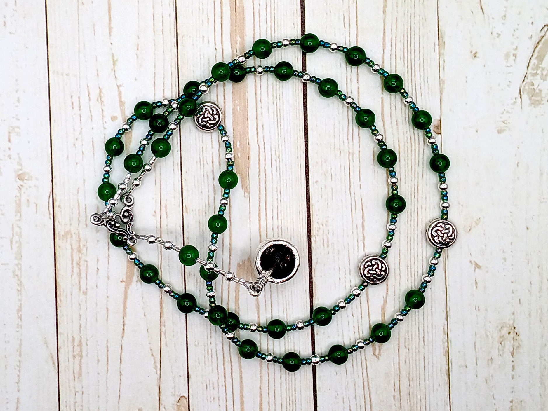 It is made with 6mm flower green agate gemstone beads and 8mm knotwork silver-toned divider beads, separated by silver-toned metal spacer beads, and glass seed beads to provide a comfortable transition from one bead to the next and to make the piece lightweight, supple, and easy to handle. The loop itself is approximately 26" (66cm) in circumference. It is designed to be used in prayer and meditation, to decorate an altar or shrine, and/or to adorn a statue.