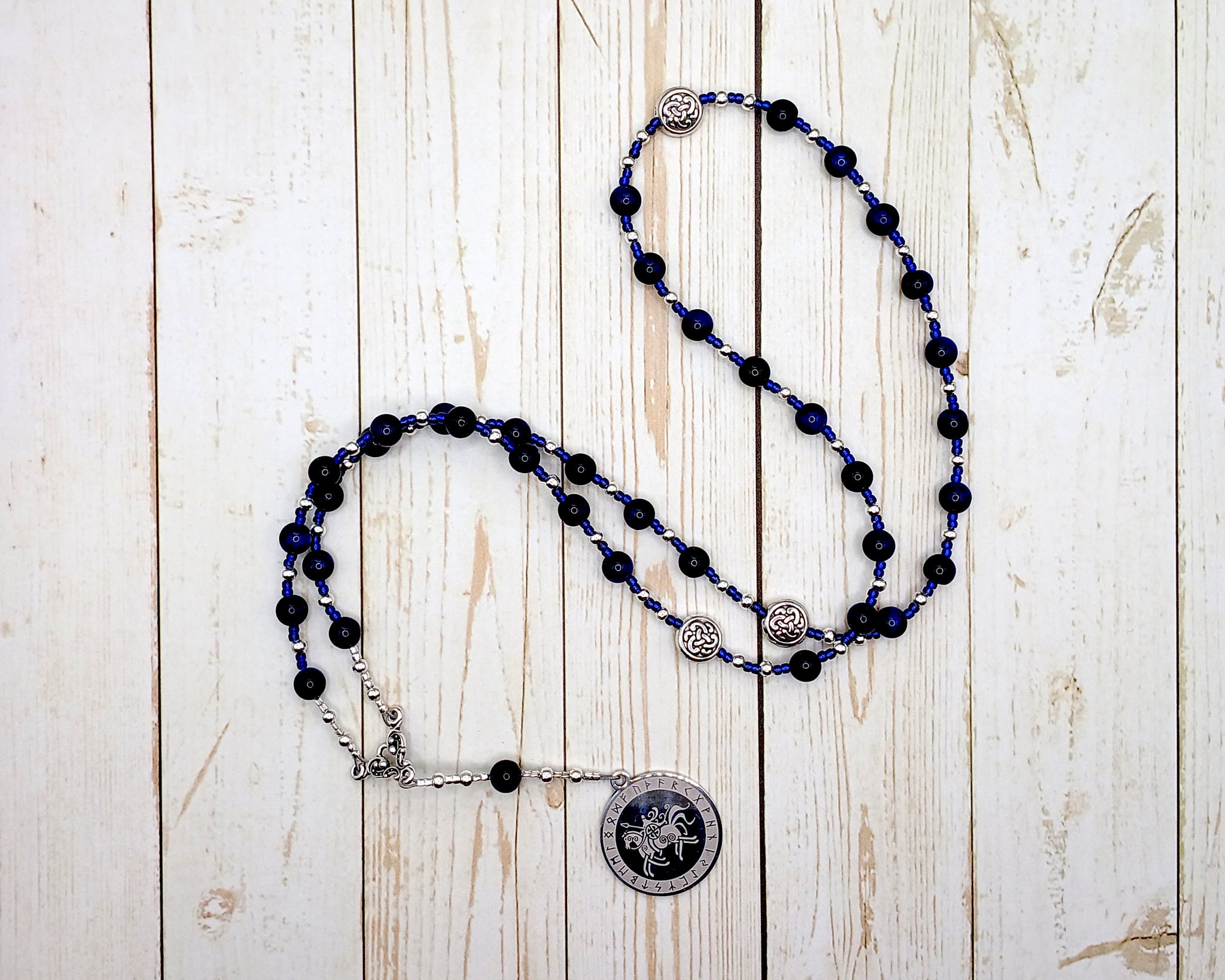 This set of Odin prayer beads in blue tiger eye consists of four sets of nine beads each on the loop, each set separated by a larger spacer bead. Joining the string is an additional bead and a pendant, an image representing the god riding the eight-legged horse, Sleipnir, the swiftest of steeds.