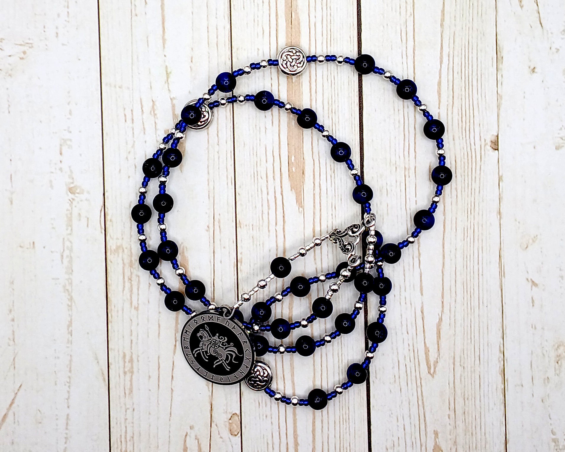 Odin Prayer Bead Necklace in Blue Tiger Eye: Norse God of Battle, Magic, Runes, Wisdom