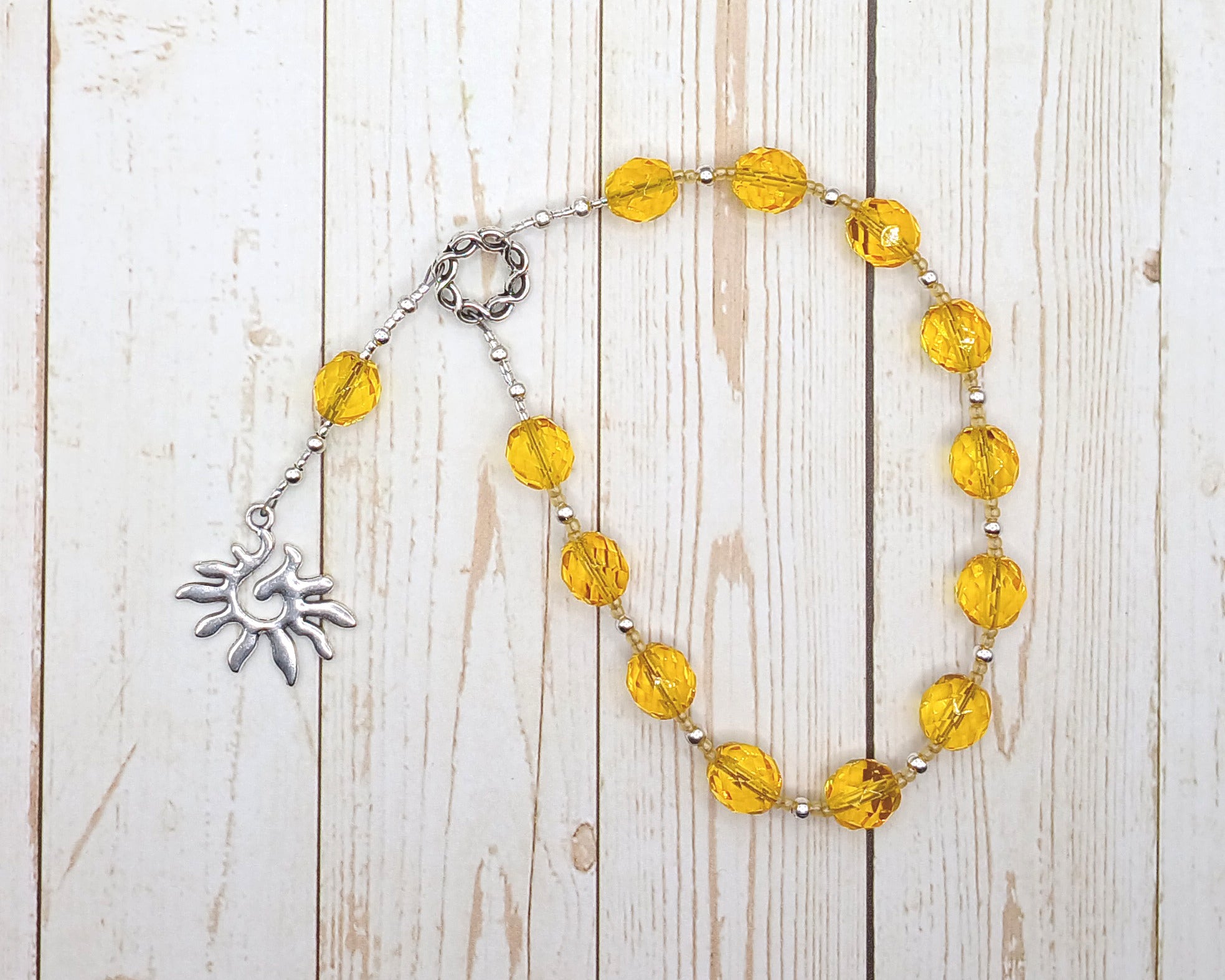 It is made with 10mm bright yellow Czech fire-polished glass beads, separated by silver-toned metal spacer beads, and glass seed beads to provide a comfortable transition from one bead to the next and to make the piece lightweight, supple, and easy to handle. The string itself is approximately 11" (28cm) in circumference and is designed to be used in prayer and meditation, to decorate an altar or shrine, and/or to adorn a statue. The small size makes it easy to keep on hand in a drawer, a purse, or a pocket.
