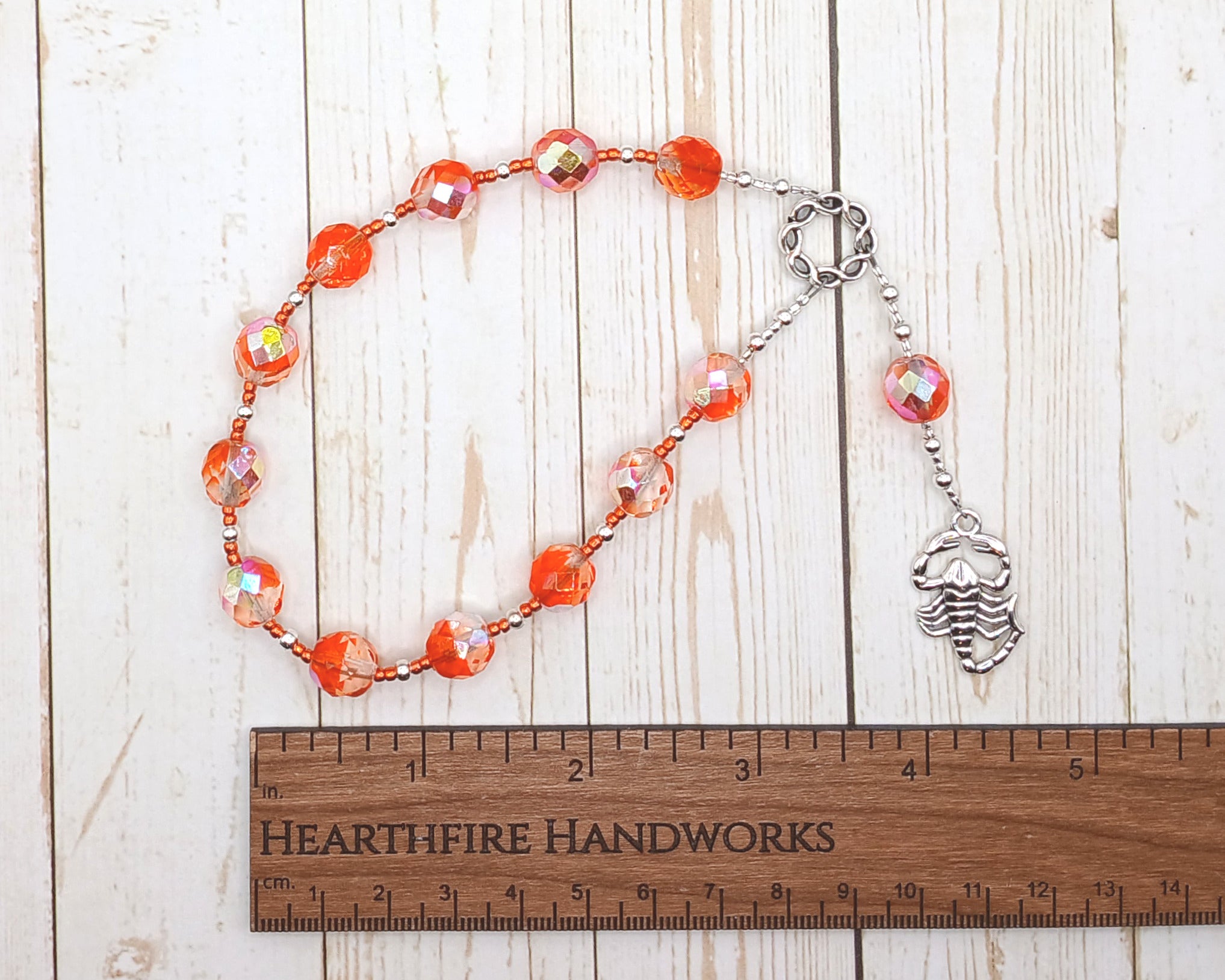 It is made with 10mm bright orange Czech fire-polished glass beads with an aurora finish, separated by silver-toned metal spacer beads, and glass seed beads to provide a comfortable transition from one bead to the next and to make the piece lightweight, supple, and easy to handle. The string itself is approximately 11" (28cm) in circumference and is designed to be used in prayer and meditation, to decorate an altar or shrine, and/or to adorn a statue. The small size makes it easy to keep on hand in a drawer, a purse, or a pocket.