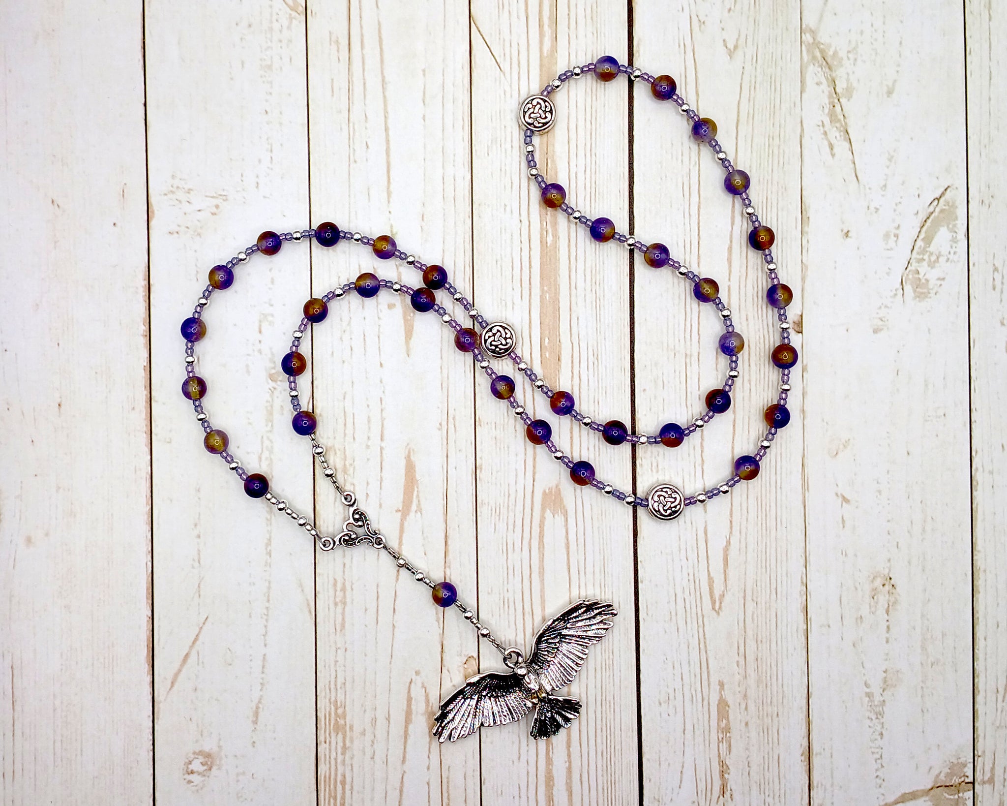 This set of Lleu (Llew Llaw Gyffes) prayer beads in ametrine consists of four sets of nine beads each on the loop, each set separated by a knotwork spacer bead. Joining the string is an additional bead and a pendant representing the god: an eagle. In myth, Lleu transforms himself into an eagle, thus escaping certain death.