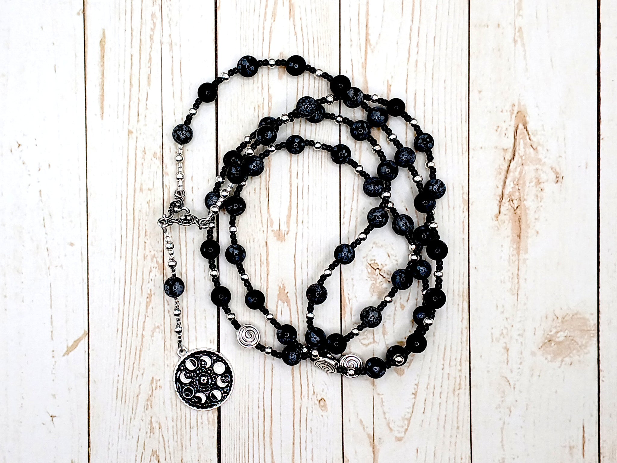 This set of Selene prayer beads consists of four sets of twelve beads each on the loop, each set separated by a larger bead. Joining the string is an additional bead and a pendant, a symbol representing the goddess: a pendant with the phases of the moon.